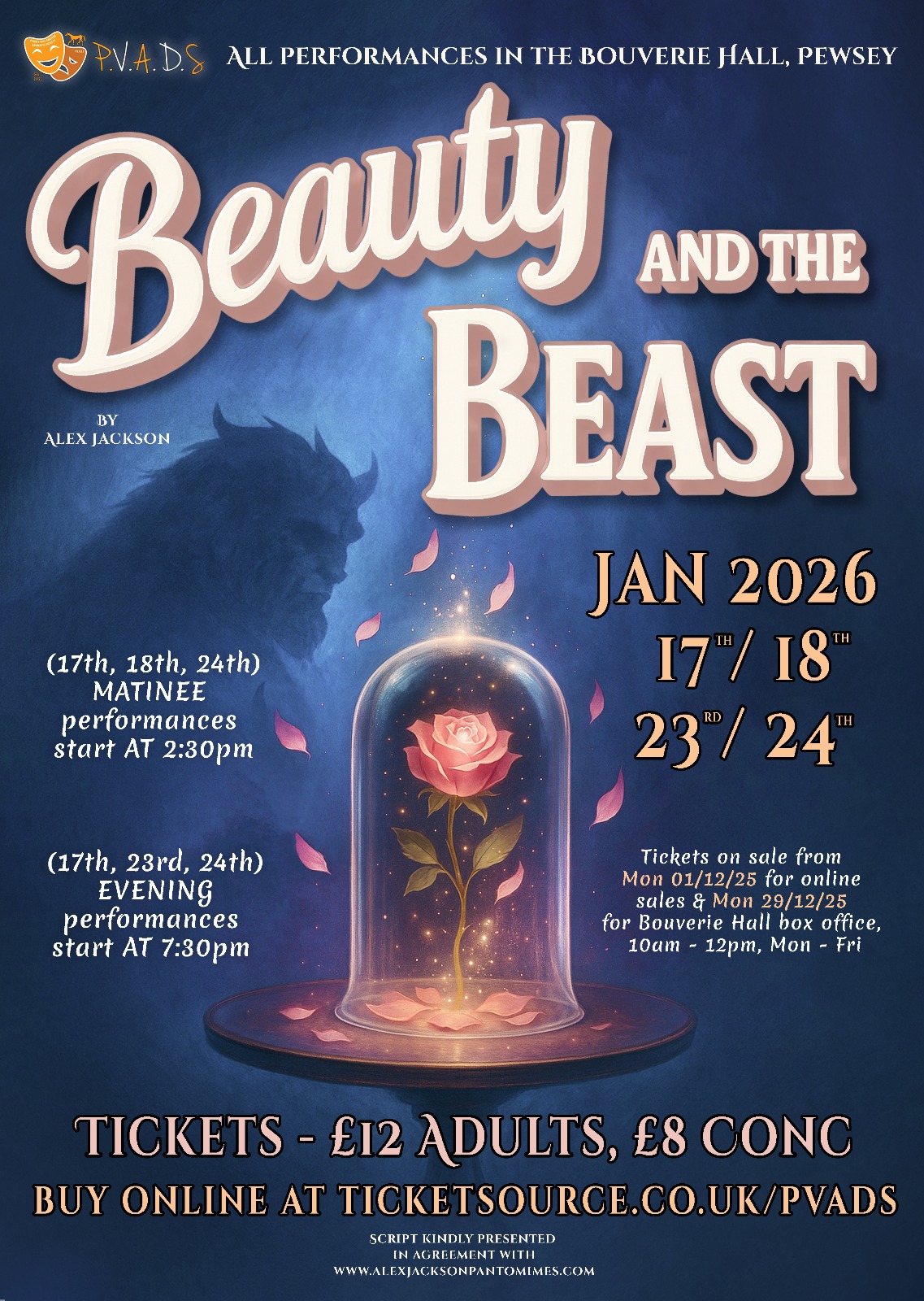 Tickets on sale from Monday 1st December online at Ticketsource.co.uk/PVADS and Monday 29th December at Bouverie Hall Box Office (open 10am to 12 noon, Monday to Friday)