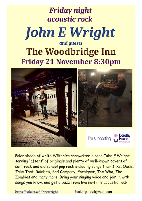 Paler shade of white Wiltshire songwriter-singer John E Wright serving “afters” of originals and plenty of well-known covers of soft rock and old school pop rock including songs from Inxs, Oasis, Take That, Rainbow, Bad Company, Foreigner, The Who, The Zombies and many more. Bring your singing voice and join in with songs you know, and get a buzz from live no-frills acoustic rock