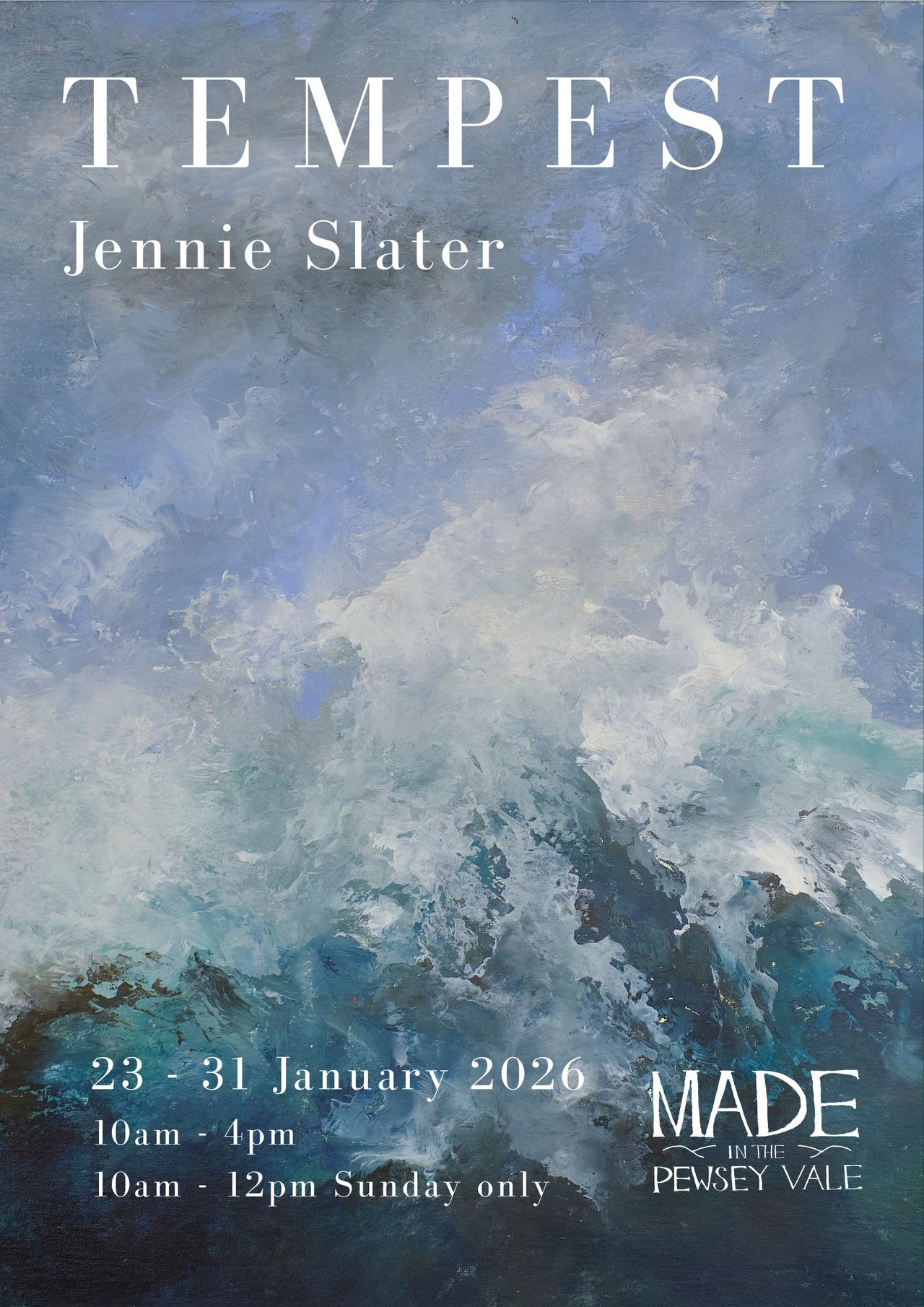Tempest is a new exhibition of paintings by Wiltshire artist Jennie Slater. Known for her dynamic depictions of wild seascapes, Slater builds layers of rich texture and movement to capture the untamed spirit of the sea. This exhibition promises an immersive encounter with its raw power and shifting moods.